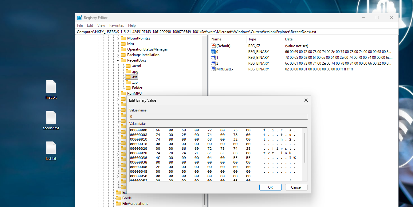I first launched the Registry Editor and checked NTUSER.DAT\Software\Microsoft\Windows\Current Version\Explorer\RecentDocs\.txt
