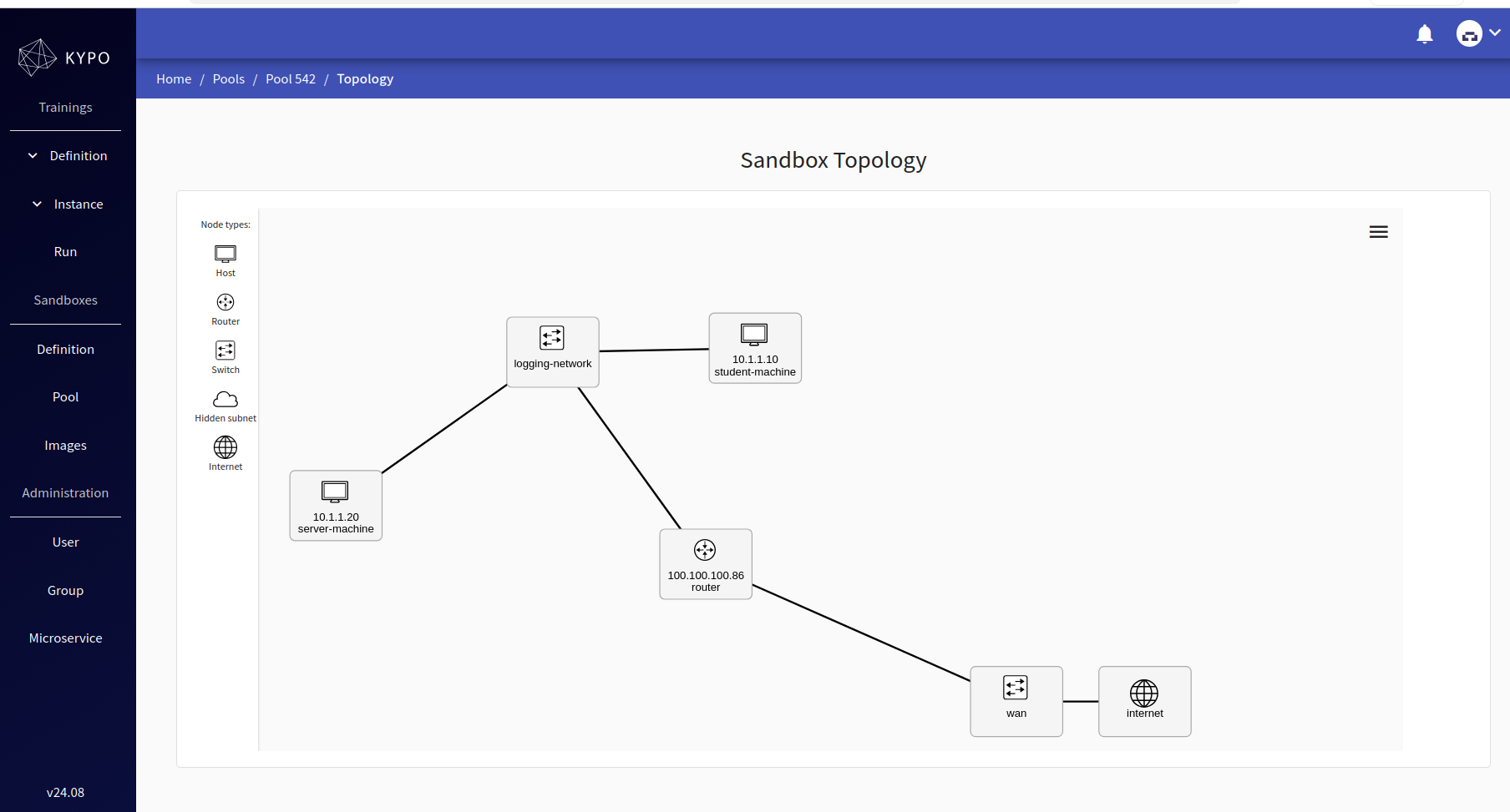 The objective of this training was to evaluate the platform rather than the training content itself. The architecture of the sandbox is defined in the topology.yml file: