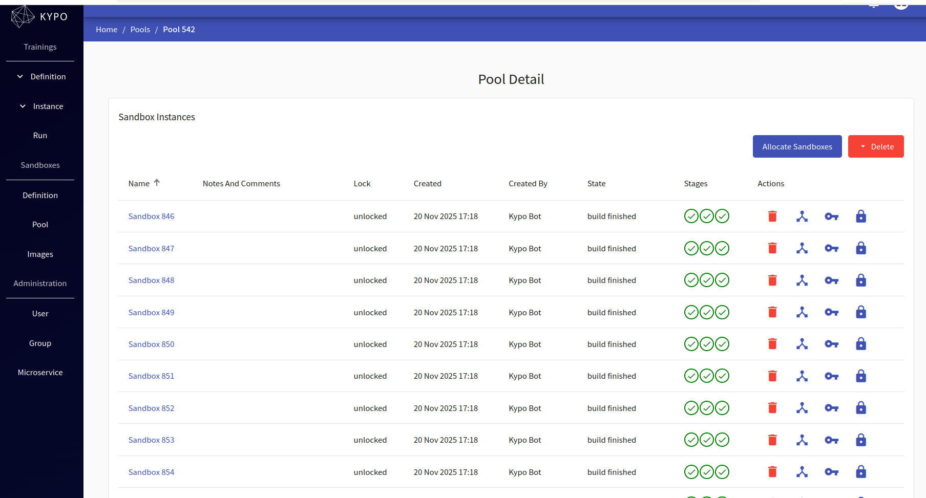 After defining the sandbox, the next step is to create a pool and allocate the sandbox instances. We have been working on pool “542”, with 30 sandboxes allocated.