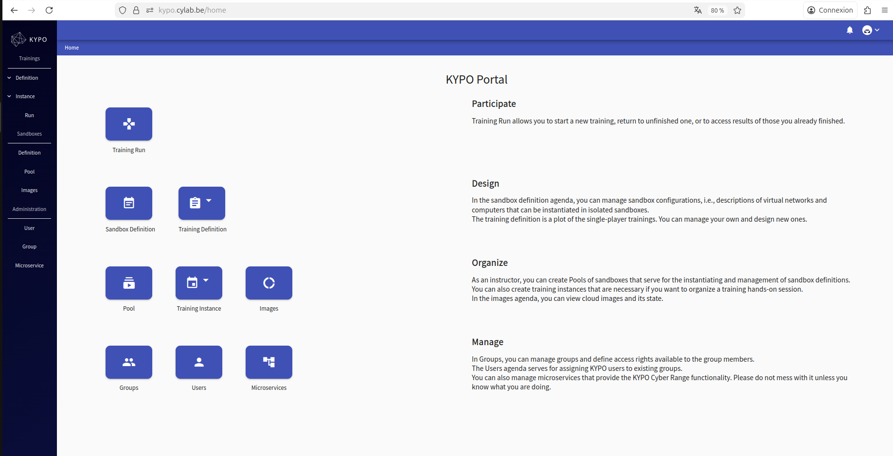 This was mandatory in order to begin using KYPO and to reach the OpenStack internal network. The kypo.cylab.be interface is reachable with this VPN configuration.