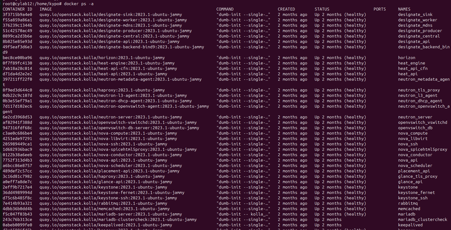 OpenStack is deployed on a running ubuntu host using kolla-ansible, which means all OpenStack components (Horizon, Keystone, Glance etc…) run inside Docker containers,This deployment pattern ensures reproducibility, easier upgrades and clean service isolation. Once the base requirements (Python, Kolla-ansible packages, Ansible dependencies and Docker) are installed, the process starts by adapting the config file /etc/kolla/globals.yml. This file defines how OpenStack will operate and the services that will be deployed depending on our needs. In addition to that, the internal & external virtual IPs «VIP» are defined in that file. Before running any playbooks, the Kolla virtual environment needs to be activated::