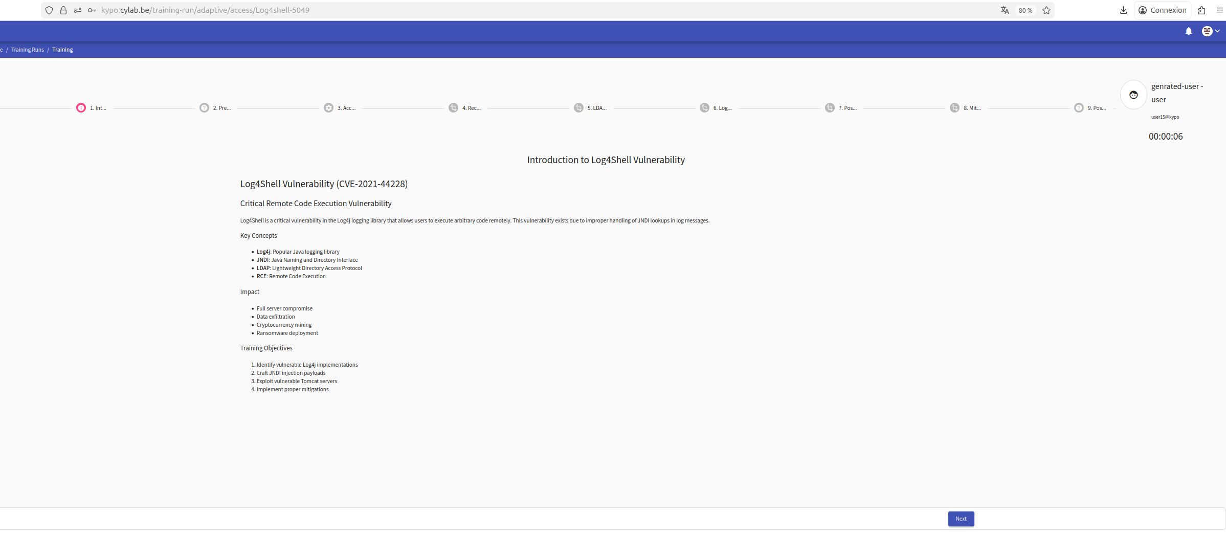 This KYPO training provides a complete walkthrough of discovering and exploiting the Log4Shell vulnerability in a safe Apache Tomcat environment. It begins with an introduction to how the flaw in Log4j works and why unsafe lookups can allow remote code execution. A short questionnaire checks the learner’s familiarity with Tomcat, Java applications, JNDI, and Linux basics before starting the lab. Once inside the environment, the learner connects to a Debian student machine and begins initial reconnaissance of the vulnerable Tomcat server.