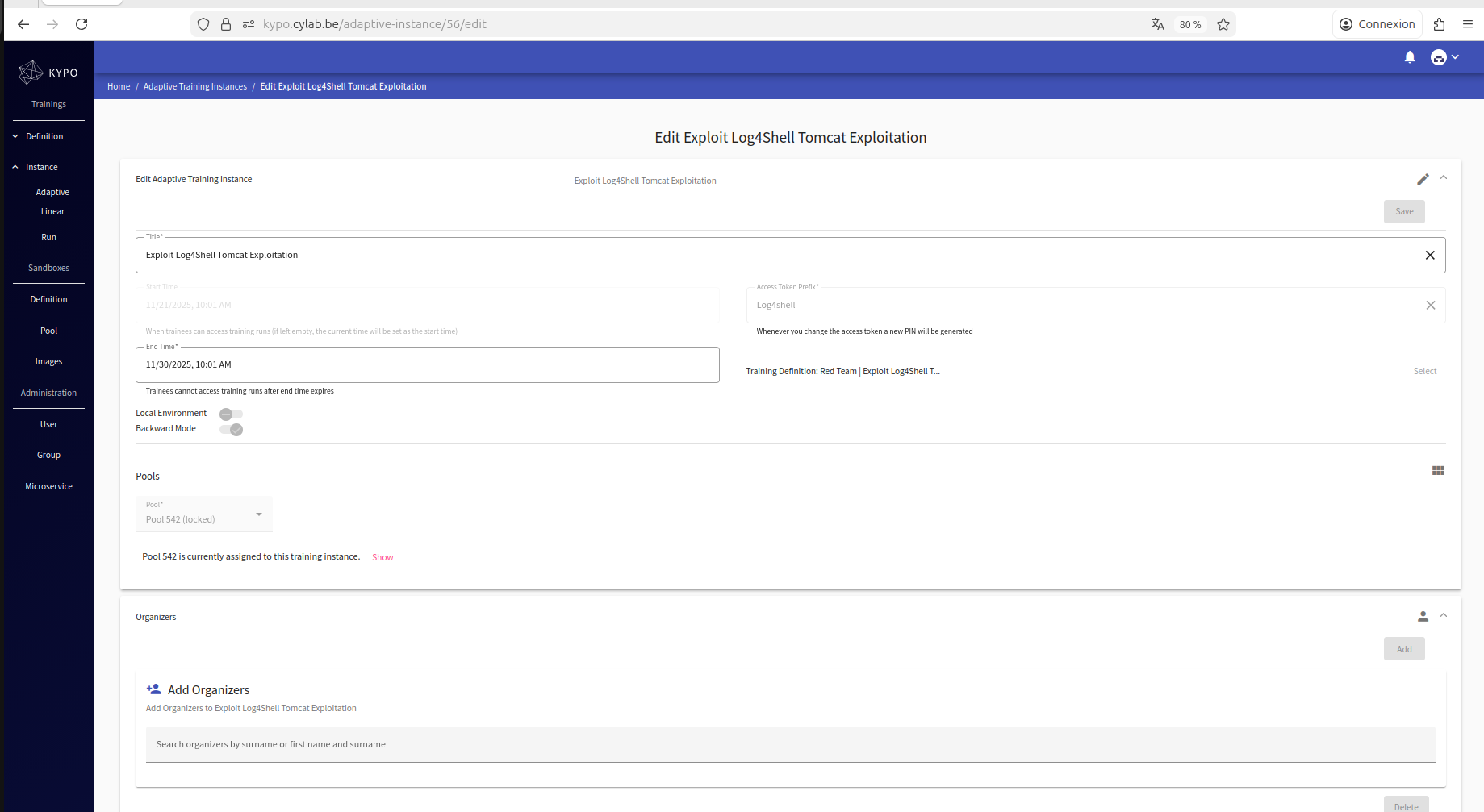 As the following screenshot shows, the KYPO interface allows us to define sandboxes and pools, configure trainings, and create instances of them. From this point, we proceeded to define our training called “Log4Shell Exploitation Lab.”