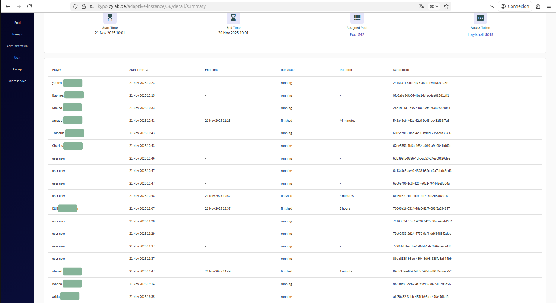 Overall, the training session ran very smoothly. In fact, we could have deployed even more sandboxes if we had not encountered disk capacity limitations on the host server. A future improvement would be to expand storage by adding additional disks, and potentially increase computing resources, as there are still available RAM slots and room to integrate an extra CPU. This would allow the platform to host multiple large training sessions with many participants simultaneously.