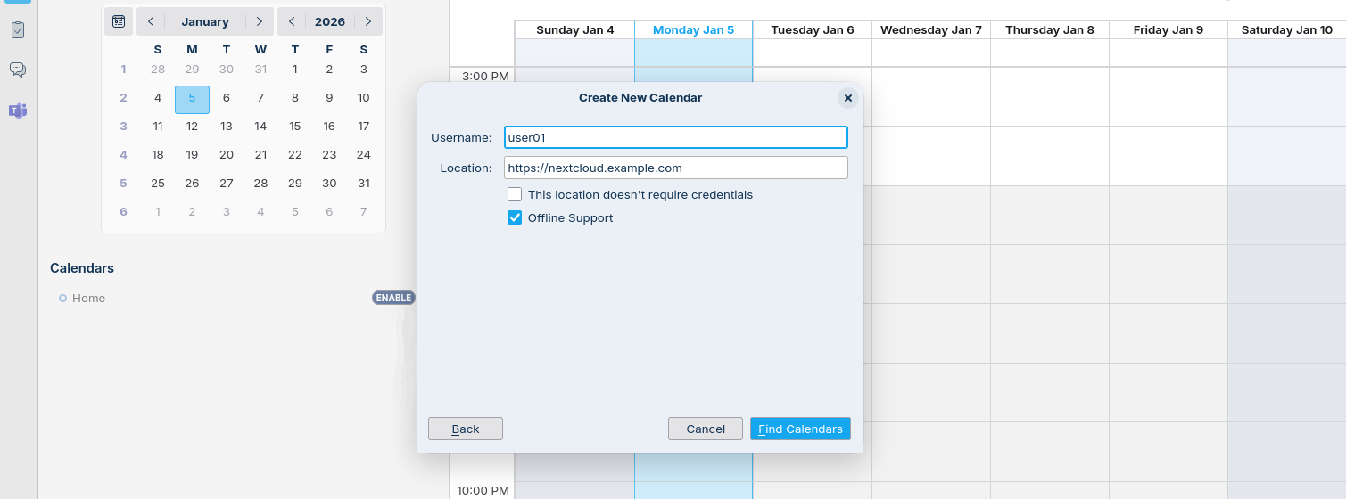 Finally, enter your username, the URL of your NextCloud instance, and the password you just created. Thunderbird will automatically fetch the list of available calendars and let you choose what to synchronize…