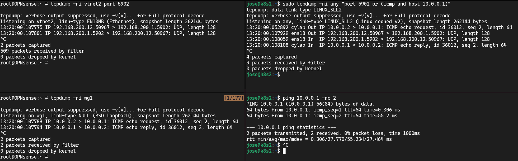 The first thing we see is the ICMP packet at the Wireguard network interface of k8s2 (top right), then the UDP packet leaving ens18 with destination the Endpoint of OPNSense, carrying the encrypted ICMP packet. We see it arrive at OPNSense’s vtnet2 interface (top left) and then see the decrypted ICMP packet arrive at OPNSense’s Wireguard interface wg1 (bottom left).