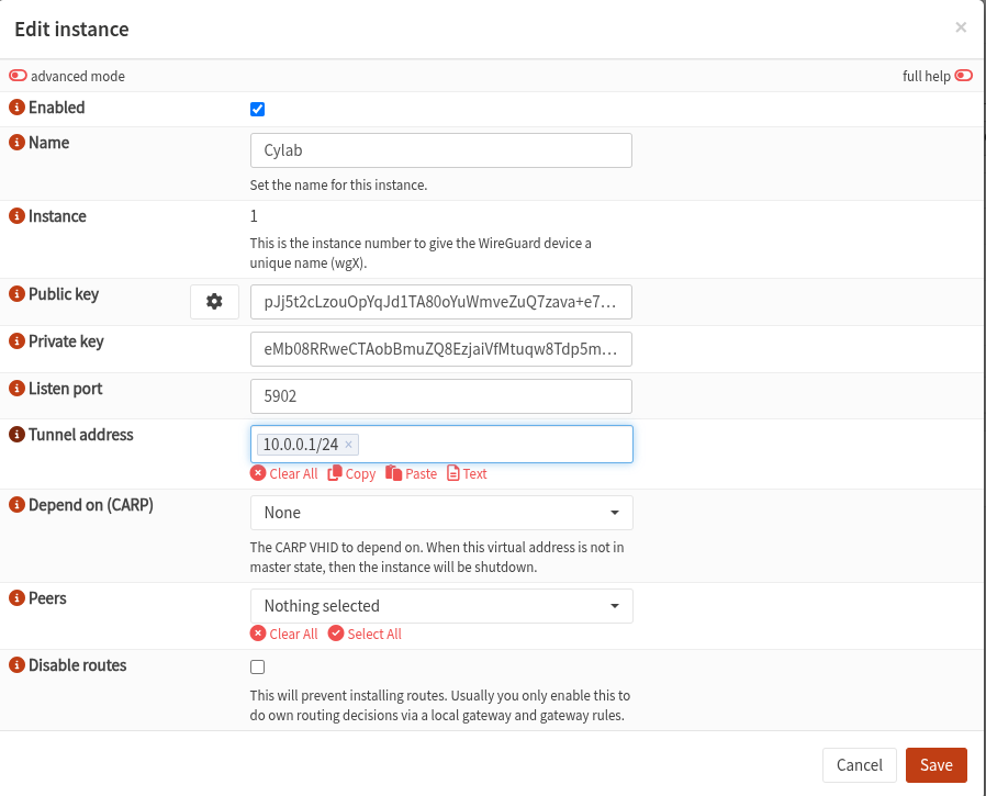 The Name field is the reference OPNSense uses for management and association with peers, it is not the name of the interface, which will always be wgN where N is the Instance field. Clicking on the ⚙ button will generate the Public and Private key for our instance. The Tunnel Address field is the IP of the Wireguard interface in CIDR notation. That is, the IP in the Wireguard VPN network. The Depend on (CARP) field is useful for OPNSense in HA mode, read this for more information. Peers is the list of Peers for this instance, there is nothing for the moment because we haven’t created any peer yet, this field will be populated as we create peers. Remember how AllowedIPs determines routing? the field Disable routes prevents automatic creation of routes.